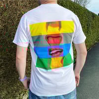 A unisex band tee from Afflecks, sporting the band "mouths" design; printed onto a white tee.
